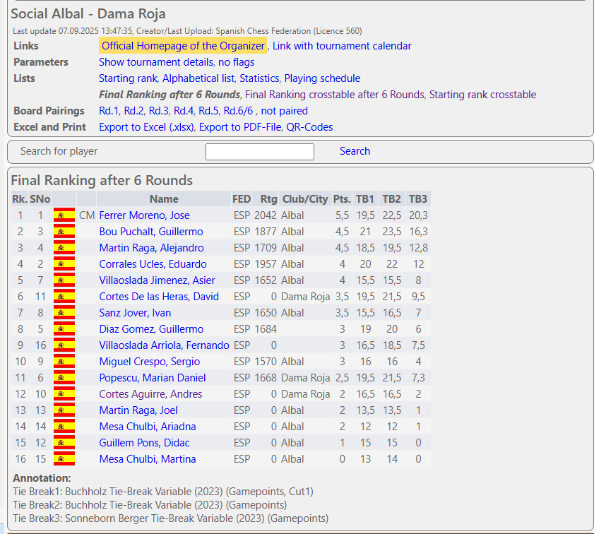 El evento reunió a un total de 16 participantes, disfrutando de un ambiente fabuloso y de mucho compañerismo. Más allá de los resultados, lo más destacado fue la sintonía entre ambos clubes, que siguen apostando por este tipo de iniciativas conjuntas que refuerzan los lazos y enriquecen la vida social ajedrecística. Tanto es así, que este torneo tendrá una segunda parte el próximo sábado en la sede de Dama Roja, donde seguro volveremos a vivir otra gran jornada.