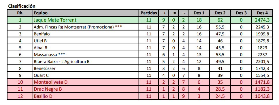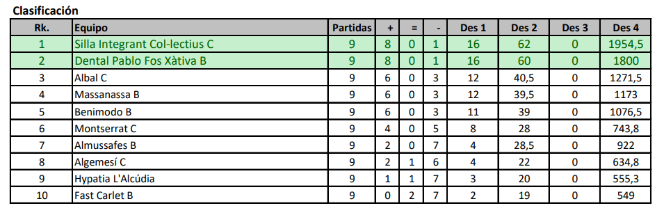 Pero el equipo supo rehacerse con fuerza. En la ronda 10, nuevamente ante Massanassa, llegó otra gran victoria por 3½-4½. Destacaron los triunfos de Antonio Selva Viu, Álvaro Benlloch Aranda y Juan Ignacio Roo Cavilla, junto a las tablas sólidas de Alejandro Martín Raga, Rafael Nicolás Gadea Martí e Iván Sanz Jover. Una victoria coral que volvió a demostrar la competitividad del equipo ante rivales directos.