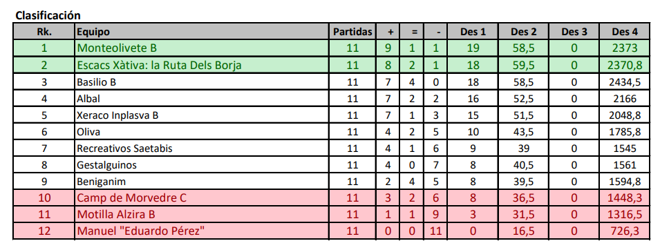 El cierre de la temporada llegó con una contundente victoria en la ronda 11 frente a Benetússer (5½-2½). Tras la derrota en el primer tablero, el equipo reaccionó con autoridad: Álvaro Benlloch Aranda, Iván Sanz Jover, Aitor Peñarrubia Gil y Sergio Miguel Crespo sumaron victorias, acompañados por las tablas de Alejandro Martín Raga, Sebastián Casan Benito y Asier Villaoslada Jiménez.